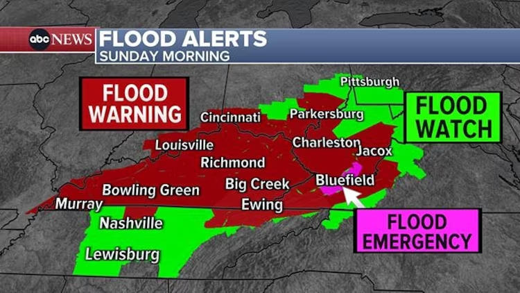 Đồ họa của ABC News này cho thấy cảnh báo lũ lụt ở Kentucky và Tennessee vào Chủ Nhật.