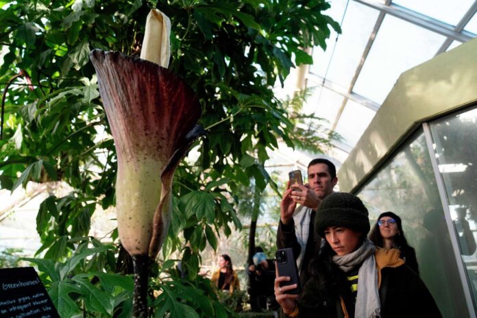 NEW YORK (AP) — Từng người một, du khách đến Vườn bách thảo Brooklyn rút điện thoại ra chụp ảnh loài cây nở hoa quý hiếm này trước khi cúi xuống để hít hà mùi hương thối rữa khét tiếng của nó, giống như mùi thịt thối rữa.