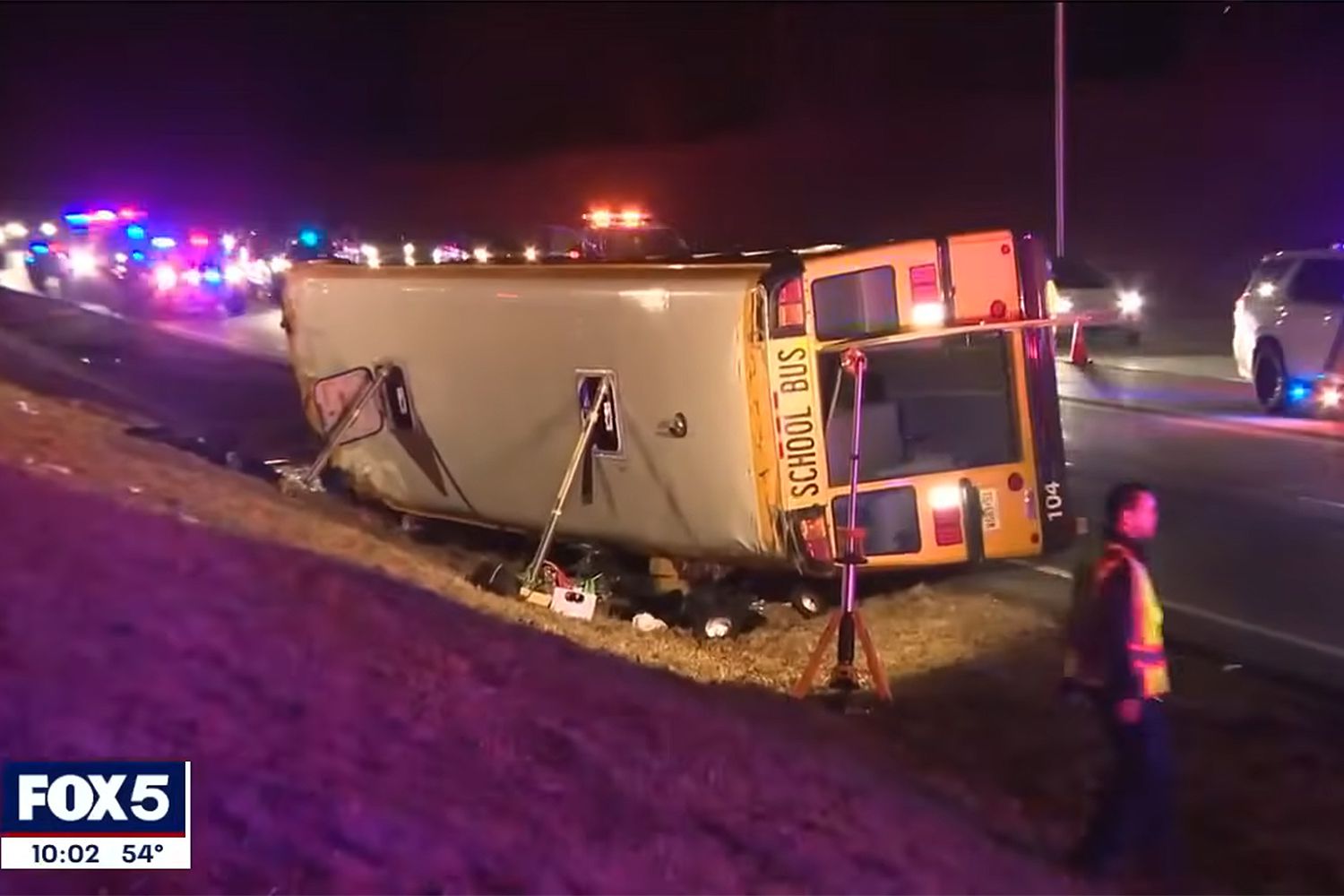 Chiếc xe buýt trường học bị lật trên đường Garden State Parkway gần Montvale, New Jersey. FOX 5 New York/Youtube